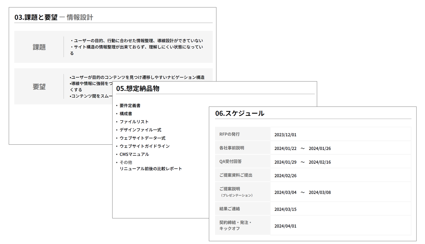 Webサイトの新規立ち上げやリニューアル、システム導入を行うにあたって、制作を外部企業へ委託する際は、自社のWebサイトやシステムの現状の課題、目的、概要、導入したい機能要件などを整理し、意図や要望を制作会社へ漏れなく伝える必要があります。そのために、要件をまとめたRFPを作成し、制作会社から最適な提案を引き出すことが重要です。