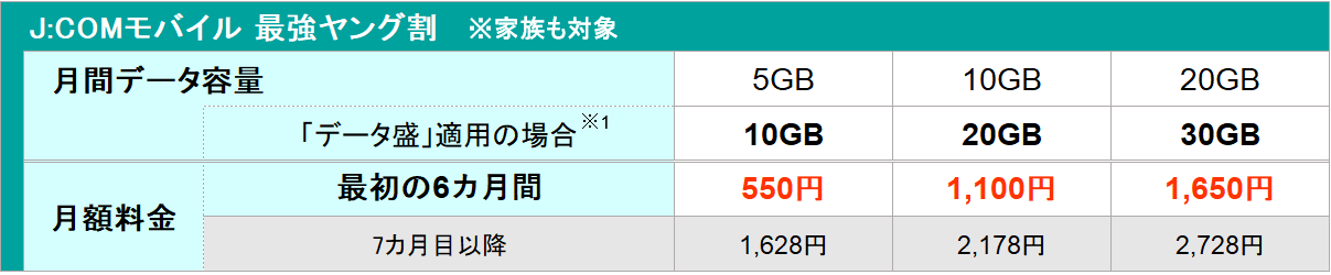 ※1 対象のJ:COMサービスとセットで「データ盛」適用。データ盛適用で5GBがデータ増量で10GB、10GBがデータ増量で20GB、20GBがデータ増量で30GBとなります。適用条件はこちら https://www.jcom.co.jp/service/mobile/price/datamori/