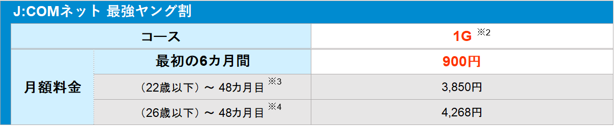26歳以下のお客さまを対象に、適用月から6カ月間、インターネットサービス「J:COM NET」1Gコースの月額料金を割引します。「J:COMネット 最強ヤング割」終了後は、22歳以下の方は「青春22割」が適用され、26歳以下の場合は「青春26割」が適用されます。