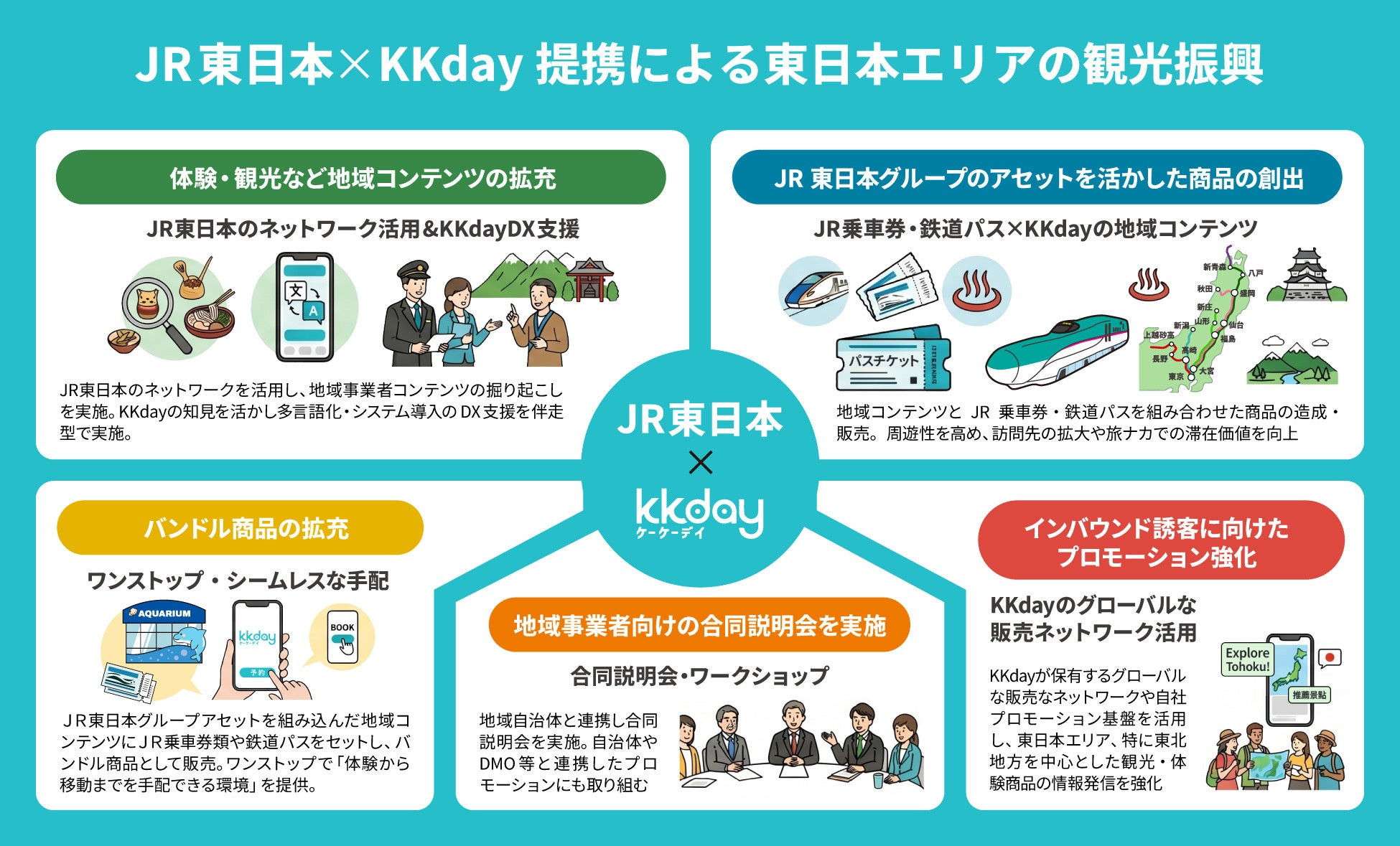 KKdayは、台湾を中心としたアジア市場をはじめ、欧米豪を含むグローバルな販売ネットワークを有し、体験型観光商品の造成・販売や、多言語・多通貨に対応した予約・販売基盤に強みを持っています。一方、JR東日本は、東日本一円に広がる鉄道ネットワークを基盤に、地域事業者や自治体と連携した観光コンテンツの創出に取り組んできました。