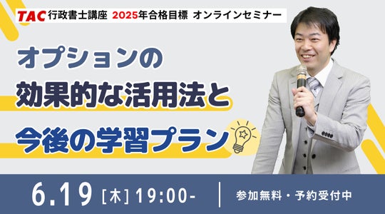 行政書士試験対策講座を展開しているTAC株式会社(東京都千代田区、代表取締役:多田敏男)は、2025年合格目標の試験対策として、TACのオプション講義の効果的な活用法を伝授するオンラインセミナーを6/19(木)に開催します。