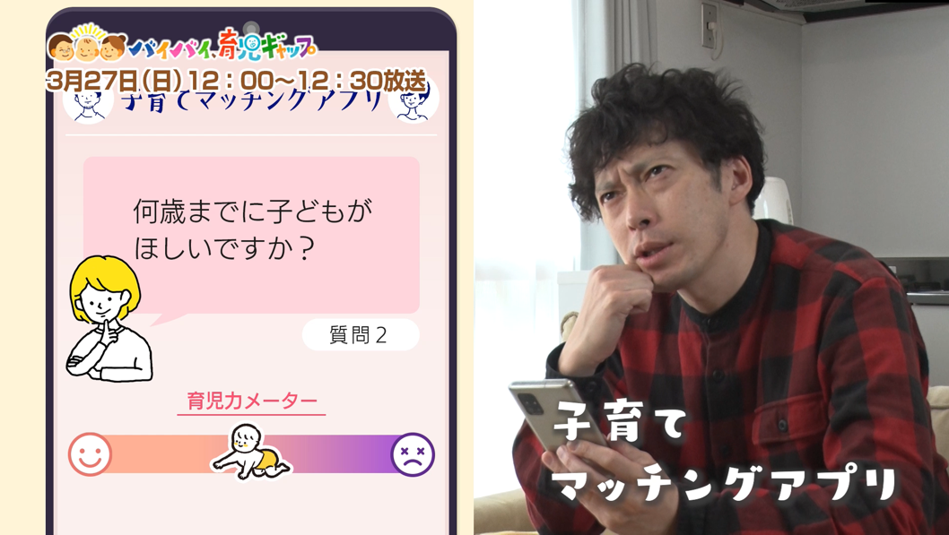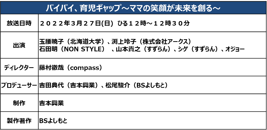 BSよしもとでは、特別番組「バイバイ、育児ギャップ」~ママの笑顔が未来を創る~を、3月27日(日)ひる12時~12時30分に放送します。