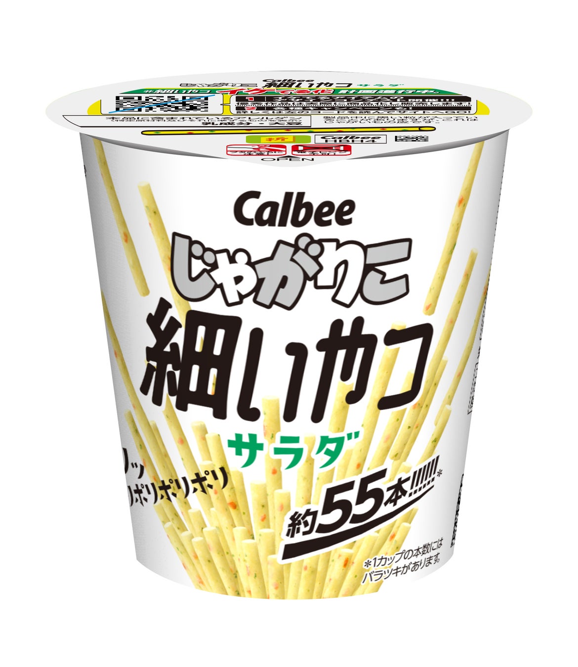「じゃがりこ サラダ」が細くなりました。「カリッポリポリポリポリ」細くて軽い食感なので、噛みやすくて食べやすい。商品の本数が約55本※2と多く入っており、満足感を感じていただけます。ニンジンとパセリを練りこみ、素材そのままの美味しさが味わえるあっさり「サラダ」味です。