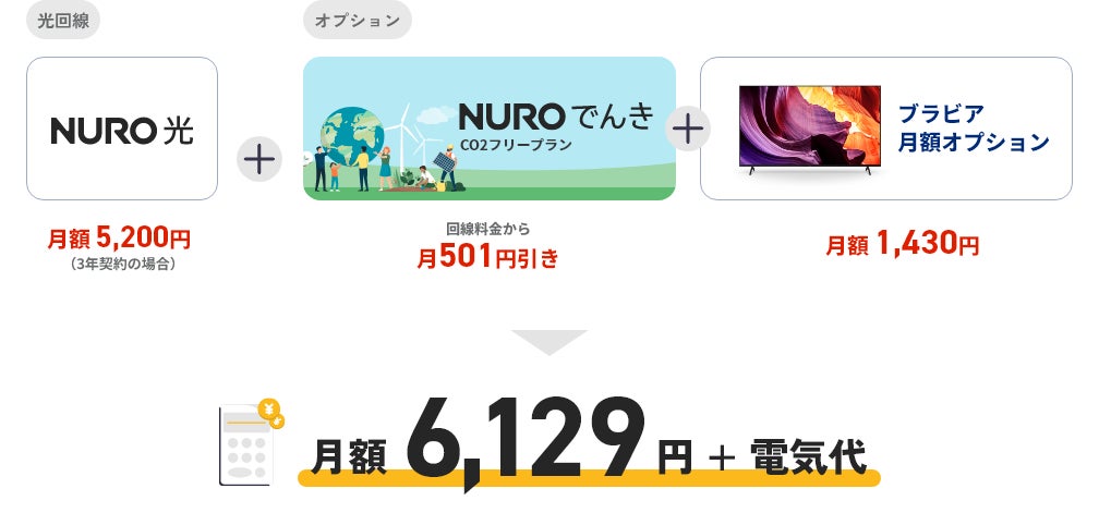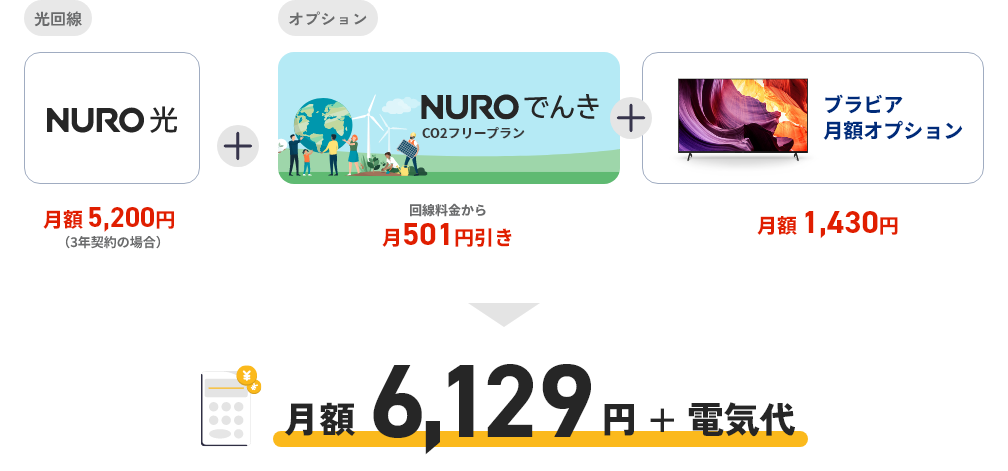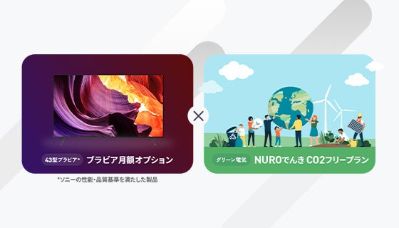 サービス名称: | 「ブラビア 月額オプション」 ※本オプションは、「NURO でんき CO2フリープラン」とセット提供になります。 また、光回線と同時での申し込みに限ります。 |
