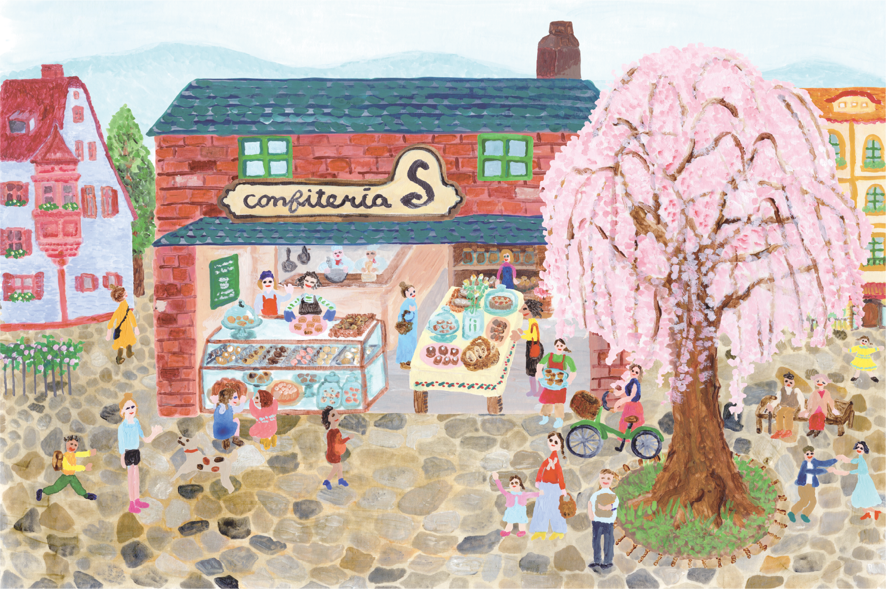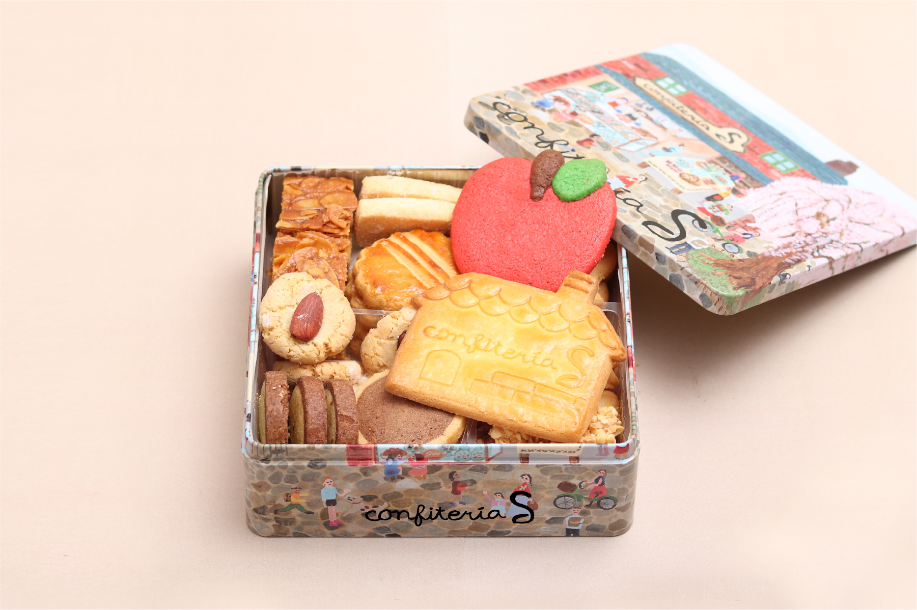 モチーフとして季節限定の「りんごサブレ」も入った、食感や風味が違うクッキーが楽しめるお菓子缶です。イラストレーターのさとうゆかりさんが描いたパッケージは「広場の中心に大きな桜の木が立つある街の人気のお菓子屋さん」を表現。