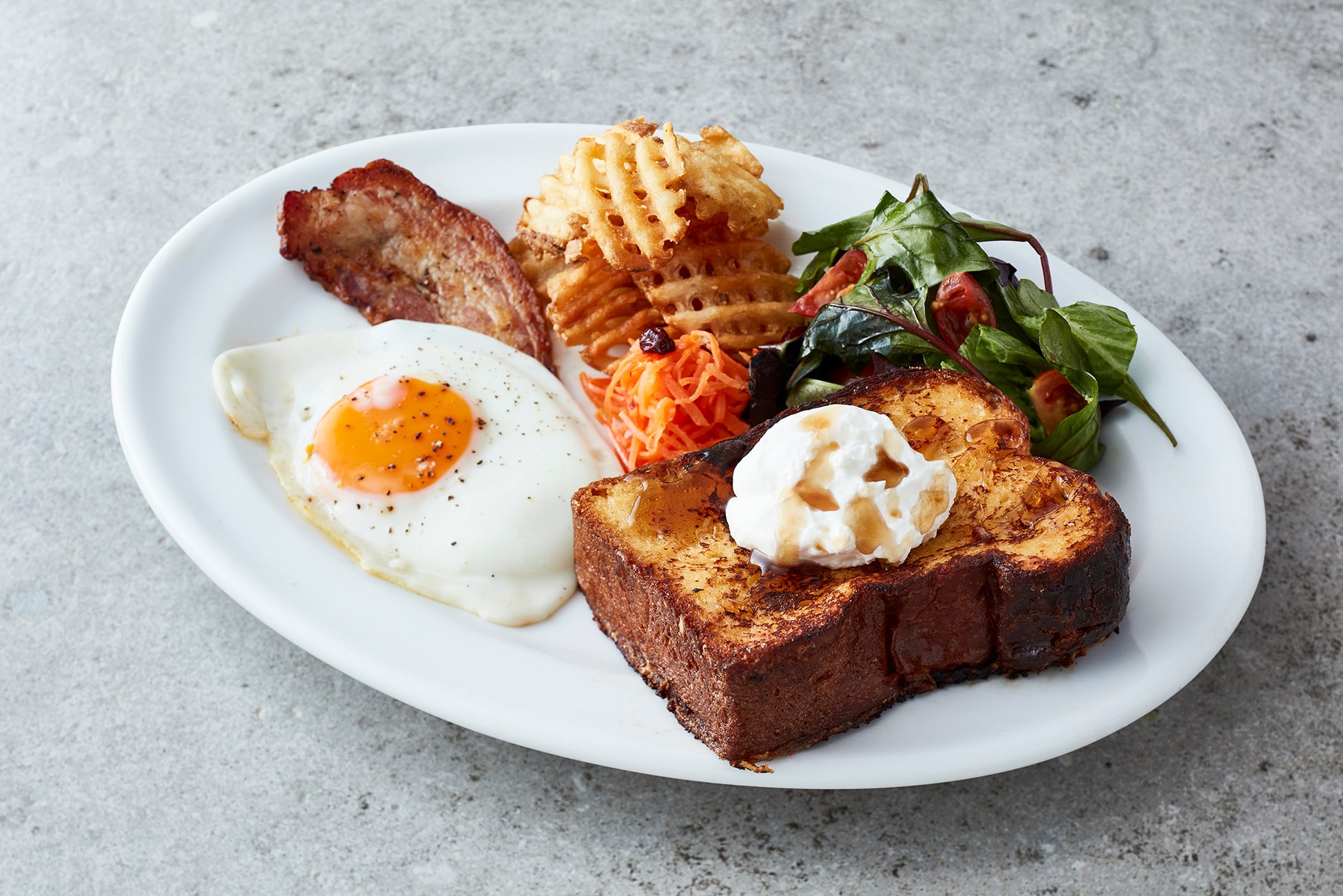 ブリオッシュ食パンをバニラビーンズ入りの自家製卵液で仕上げた甘味たっぷりなフレンチトーストのワンプレート。