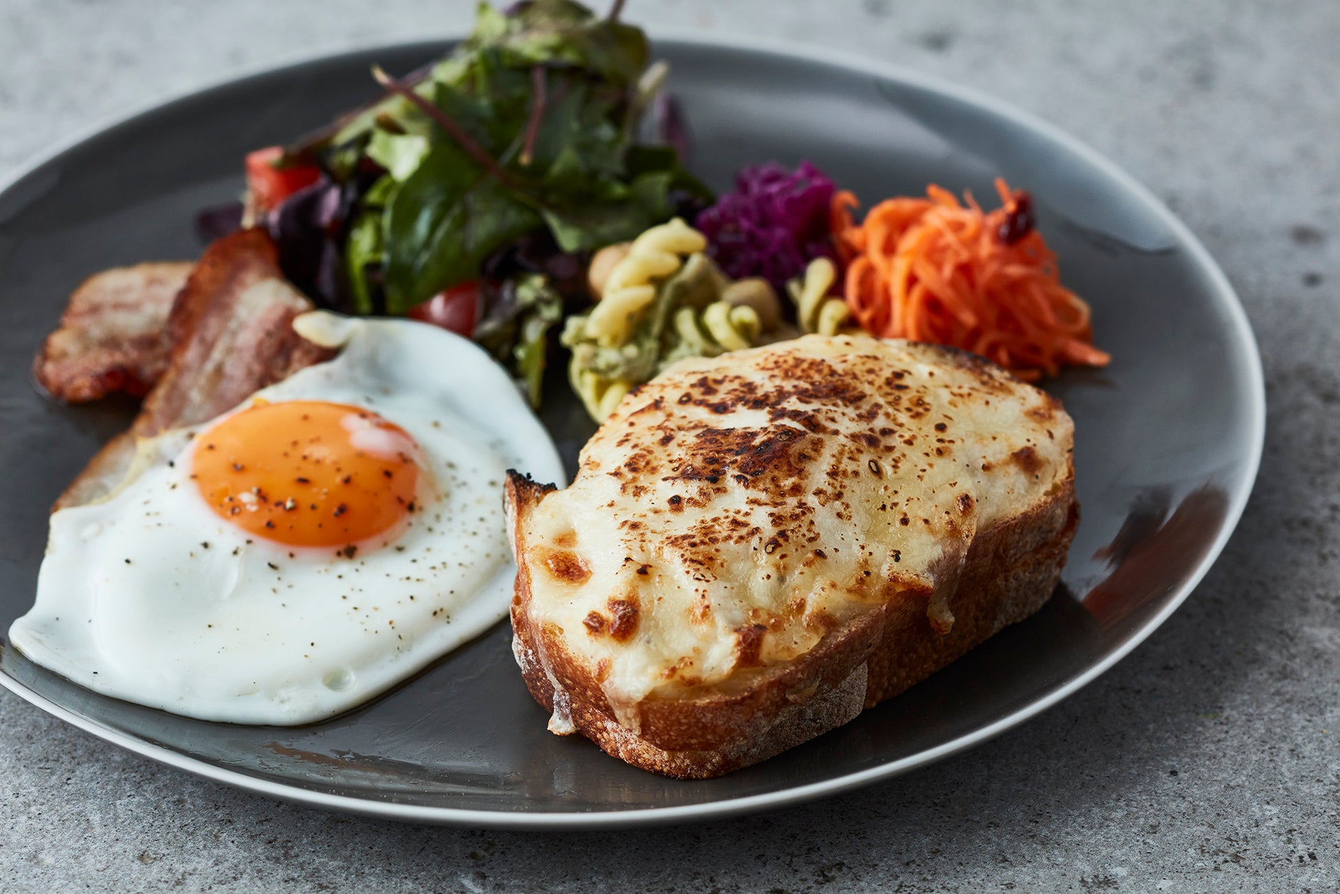 パスタにも使用するデュラム粉を100%使用したパンにベシャメルソース、ハム、グリエールチーズを挟んだオリジナルクロックムッシュのワンプレート。