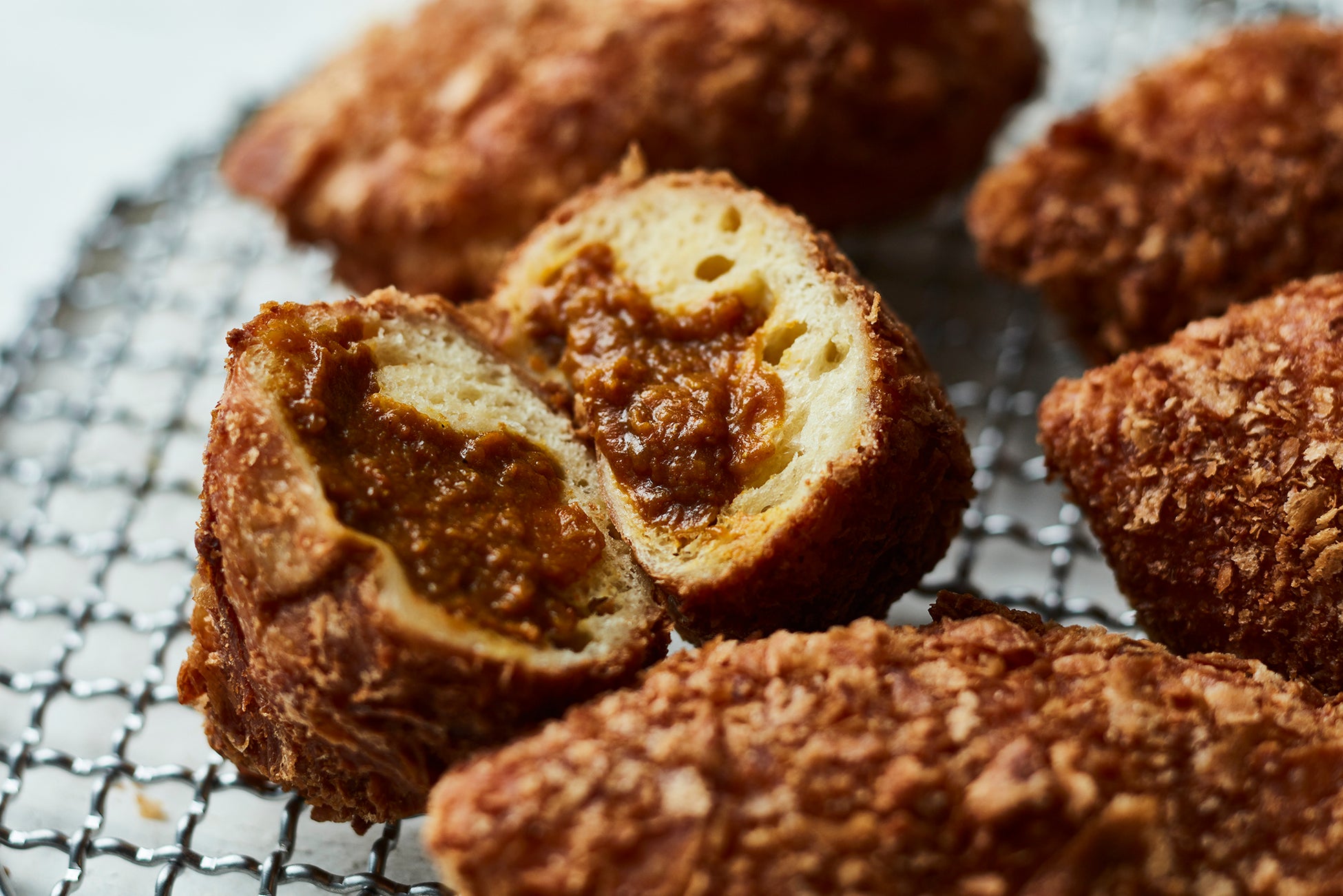 ドーナツ生地にごろっとした牛肉入りのカレールーを包み、クロワッサンで作った生パン粉を付けて揚げました。