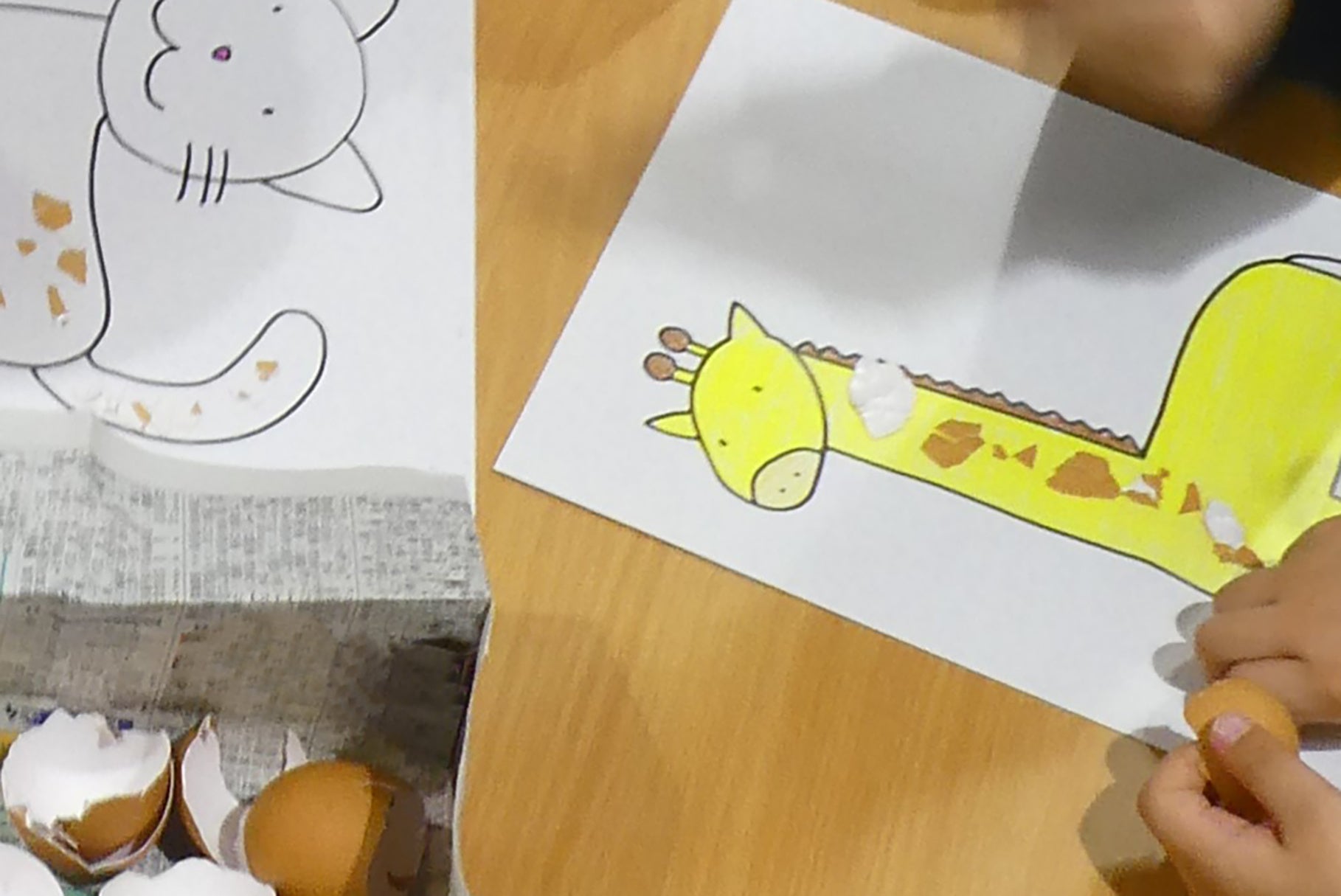 内容: レストランで使用された卵のカラを使った貼り絵や絵本を使った生き物の仲間わけ体験