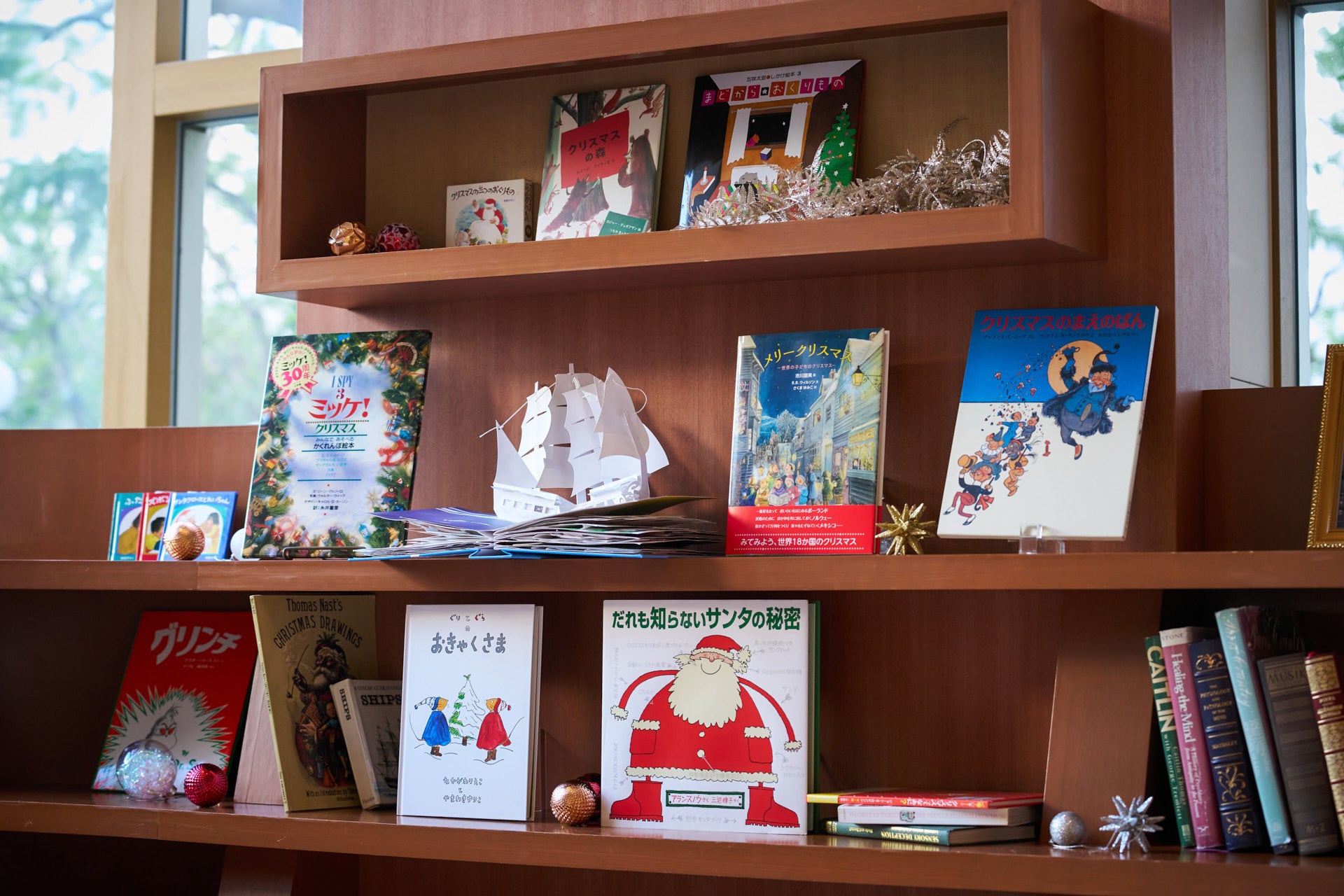 11月15日(水)から館内に常設展示される「ライブラリースペース」では、児童文化学科の学生が選書した、お子様から大人まで楽しめる絵本や図鑑を常時100~150冊ご用意し、シーズンごとに季節を感じる本を紹介いたします。11月15日(水)~1月9日(火)まではクリスマスがテーマです。チェックイン時やレストラン、ご宴席でお越しの際にぜひお気軽にお立ち寄りください。また、ご宿泊のお客様は、客室へお持ちいただくことも可能ですので、お子様への読み聞かせなどにもご利用いただけます。