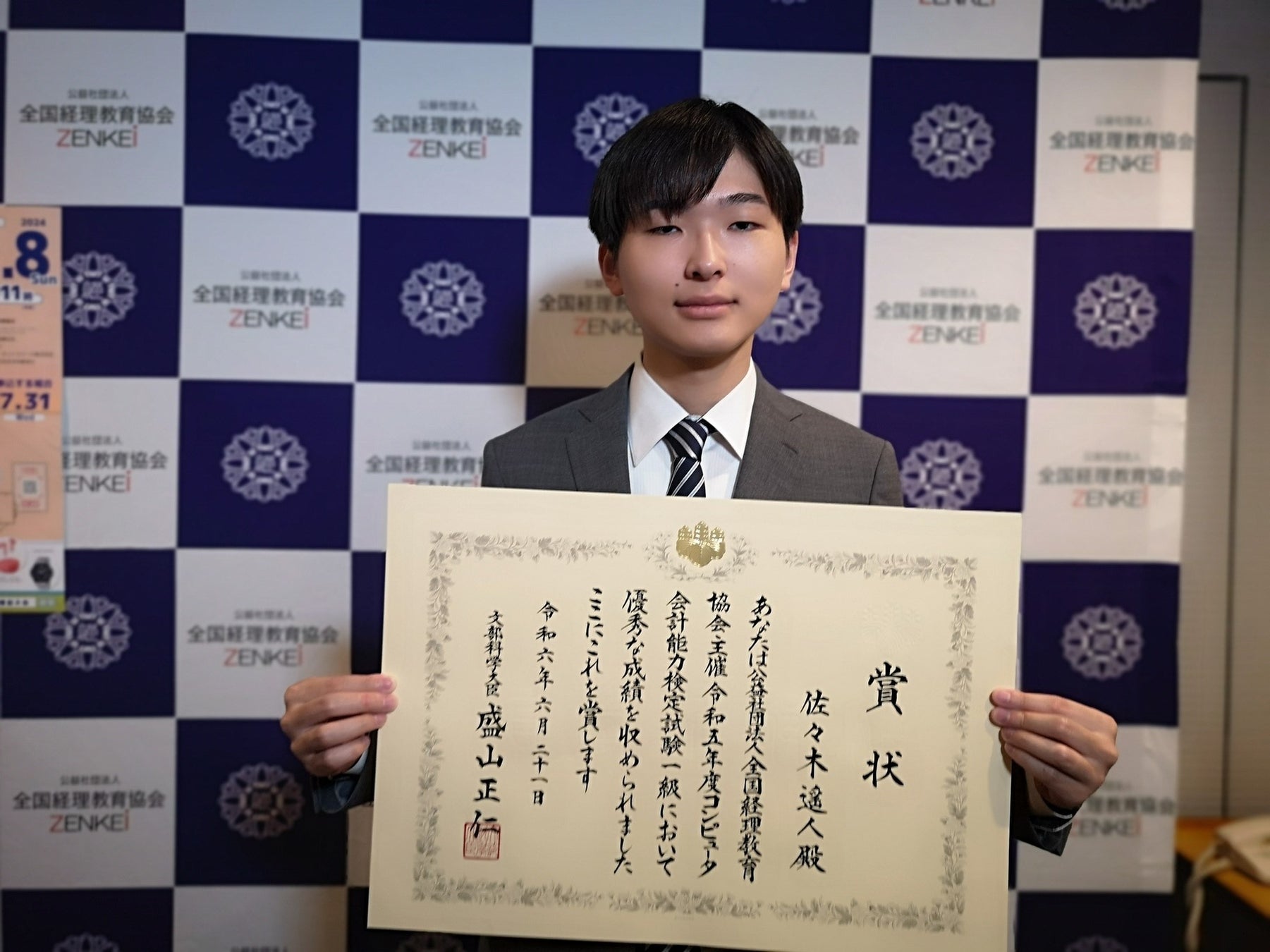 佐々木さんは令和5年度(第46回・47回合計)コンピュータ会計能力検定試験受験者1,575名(うち1級受験者83名)の頂点満点合格を達成。当校での文部科学大臣賞受賞は、一昨年の「消費税法能力検定1級」、昨年の「コンピュータ会計能力検定試験1級」に次ぐ3年連続の受賞となります。