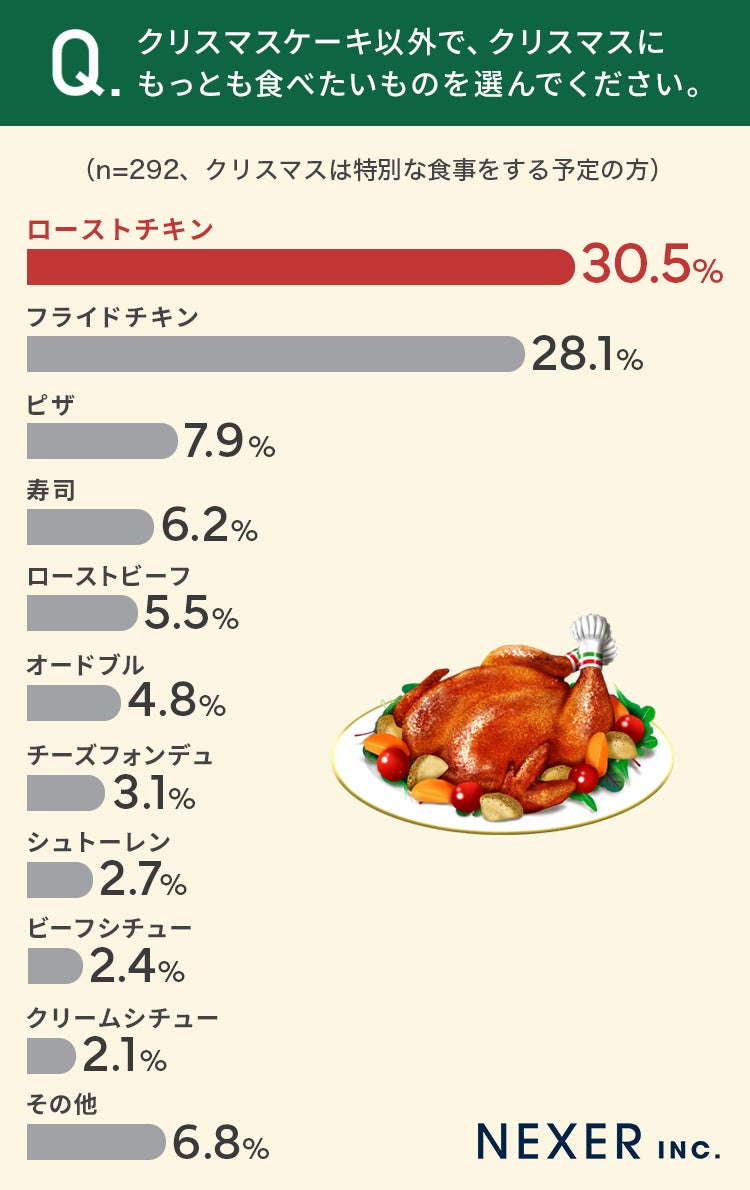 30.5%の方が「ローストチキン」、28.1%の方が「フライドチキン」と回答しており、ツートップになりました。
