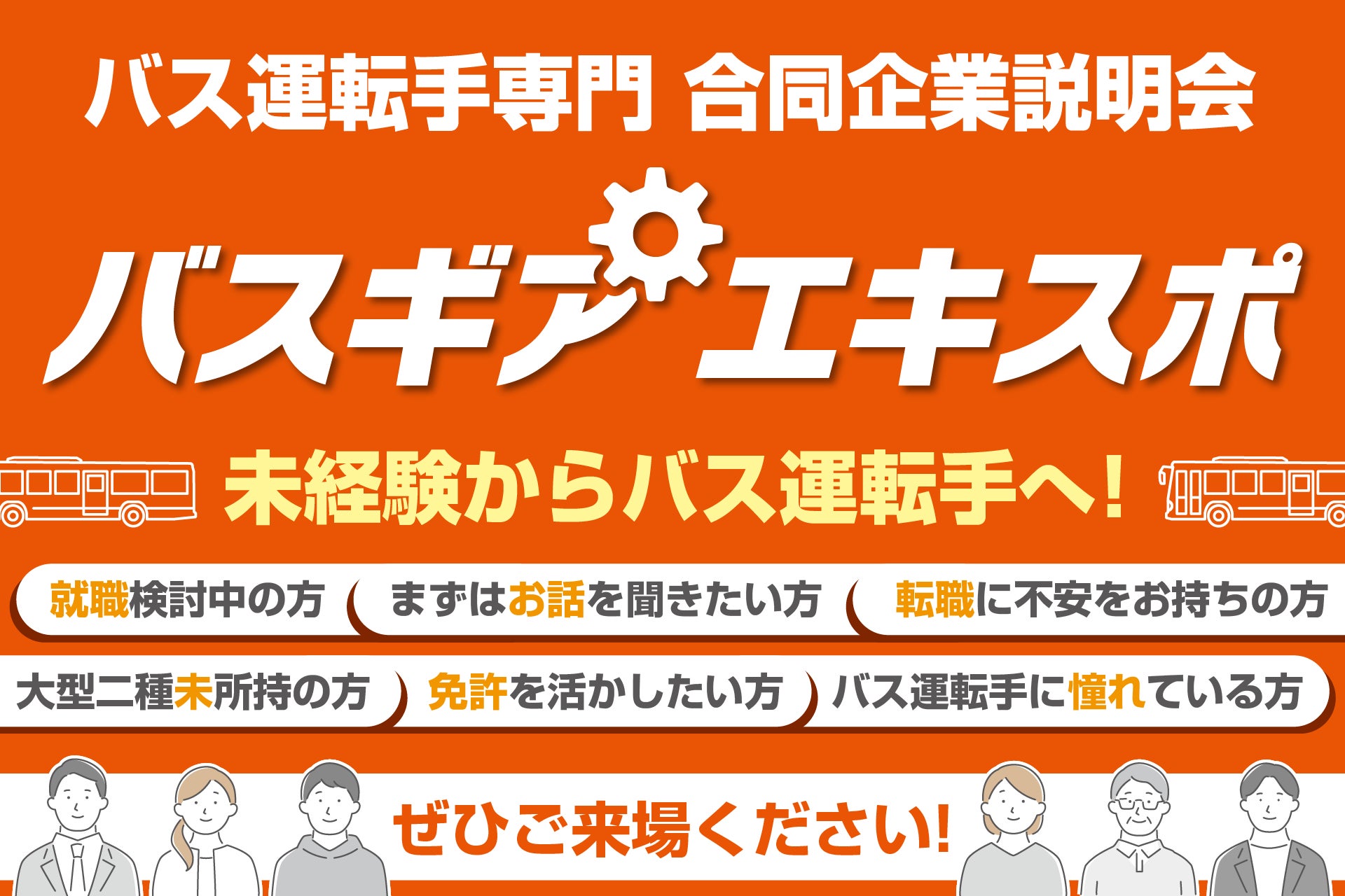 「バス運転手」に特化した合同企業説明会です。バス運転手に興味がある方なら年齢や性別を問わずどなたでも参加可能、バス業界を軸に就職を検討中の方にピッタリのイベントです!