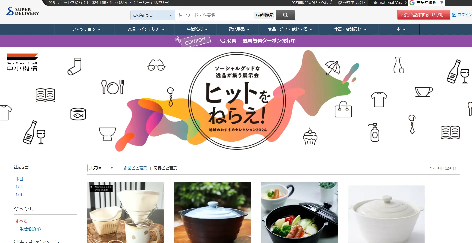 「スーパーデリバリー」は、国内メーカーと小売店やサービス業などの事業者が取引する卸・仕入れサイトです。日本の事業者を対象とした国内版に加え、世界134か国への卸販売が可能な越境版も展開しています。アパレルや雑貨を中心に、家具、生活家電、食品など幅広いジャンルの商品が約170万点掲載されています。