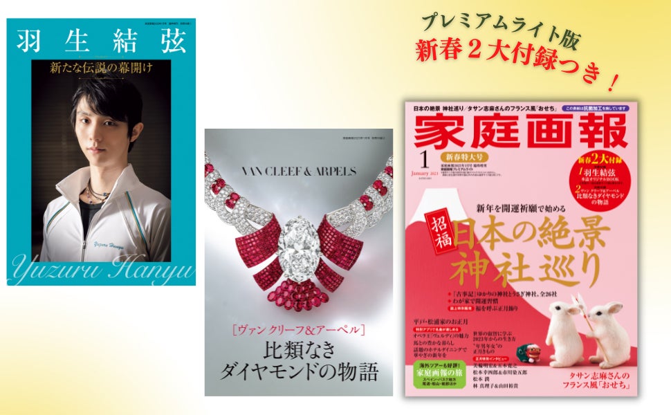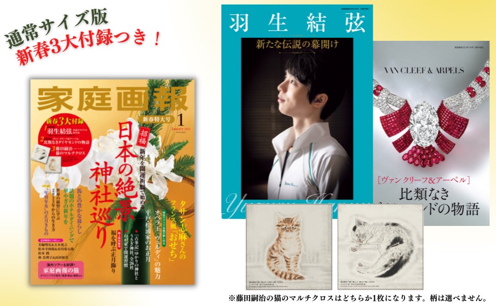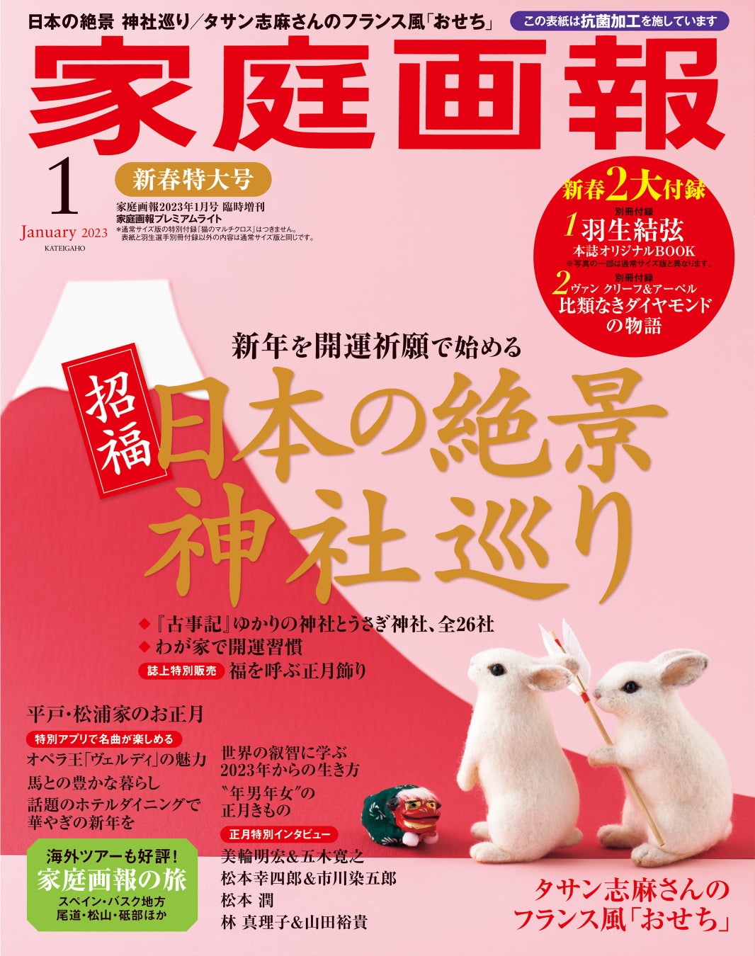 『家庭画報2023年1月号』(2022年12月1日発売)は、「新年を開運祈願で始める 日本の絶景 神社巡り」と題し、「古事記」ゆかりの神社とうさぎ神社、全26社をご紹介するなど、2023年の幕開けにふさわしい内容でお届けしています。また、2023年のNHK大河ドラマ「どうする家康」の主演 松本潤さん、歌舞伎界を牽引する松本幸四郎さん&市川染五郎さん親子、2023年の時代の顔として山田裕貴さんほか、いま話題の方々が登場。さらに特別付録として ①「羽生結弦オリジナルBOOK」、②「別冊付録 ヴァン クリーフ&アーペル」、③「藤田嗣治 猫のマルチクロス」(※③は通常サイズ版のみ)がつくなど、一つ一つの企画にも大きな反響をいただいています。