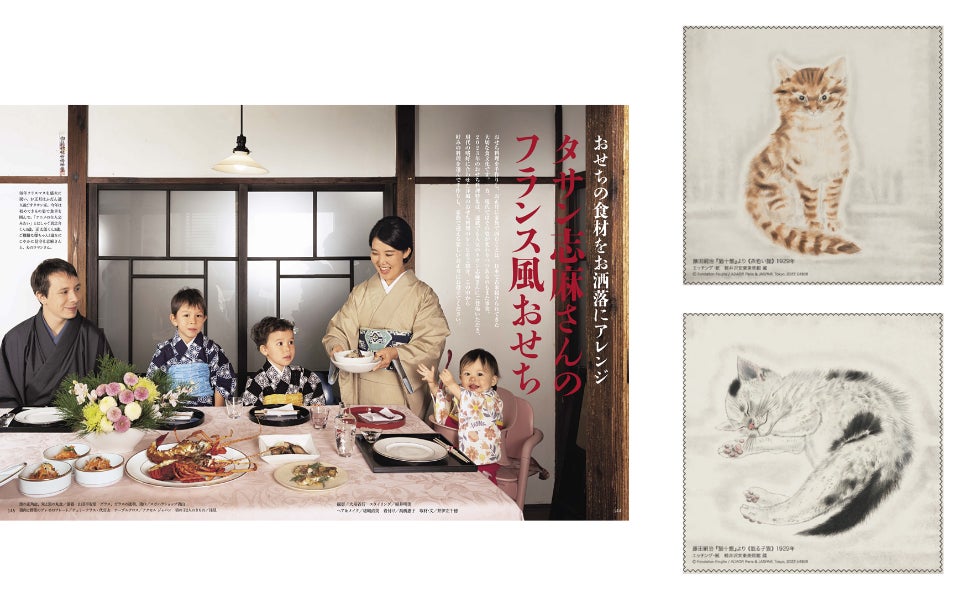 日本のみならず世界で初めて、藤田嗣治の作品だけを展示する個人美術館として、開館された軽井沢安東美術館。『家庭画報2023年1月号』通常サイズ版では、新春3大付録の一つとして、眼鏡やスマートフォンのお手入れに便利な「藤田嗣治 猫のマルチクロス」が付いています。柄は2種類、『猫十態』より≪眠る猫≫または、≪茶色い猫≫どちらかが入っています。※柄は選べません。