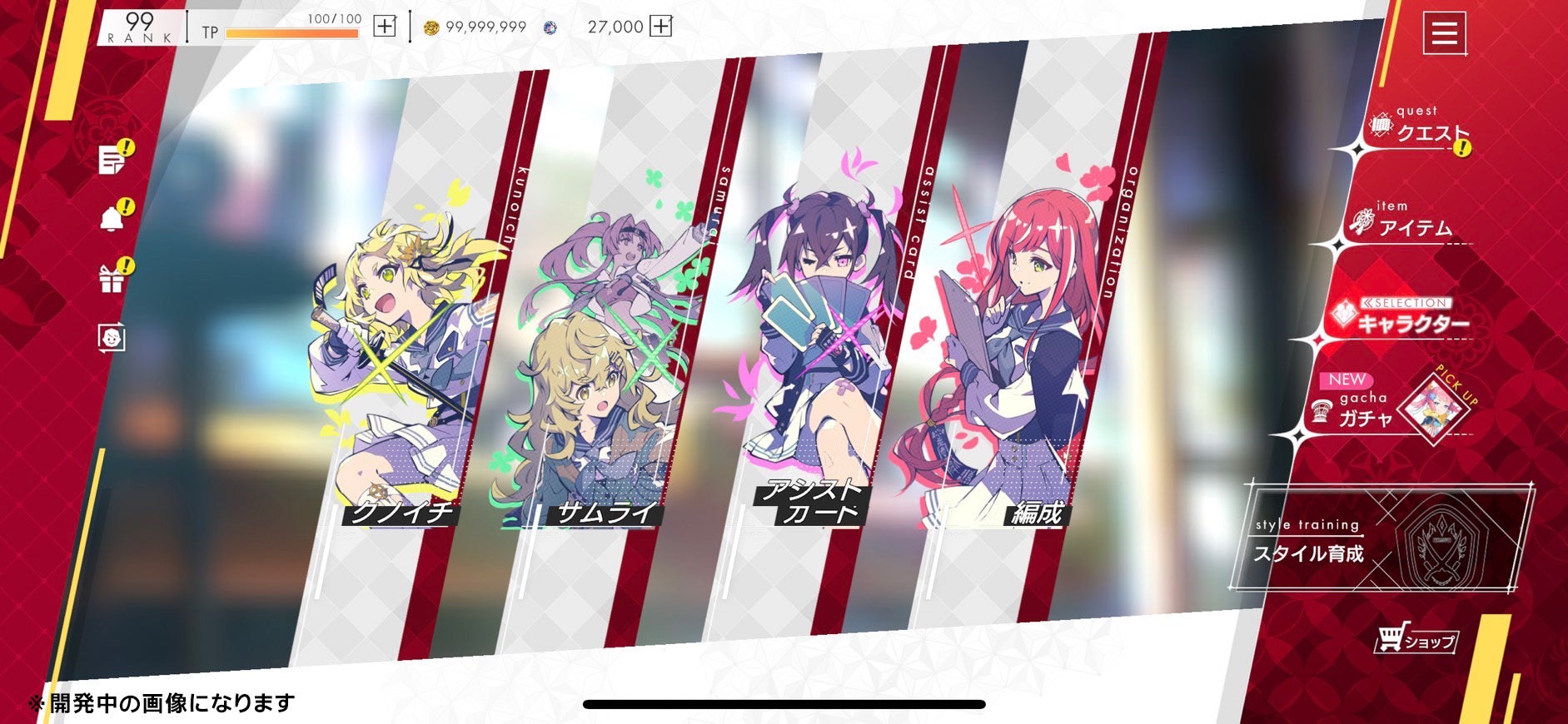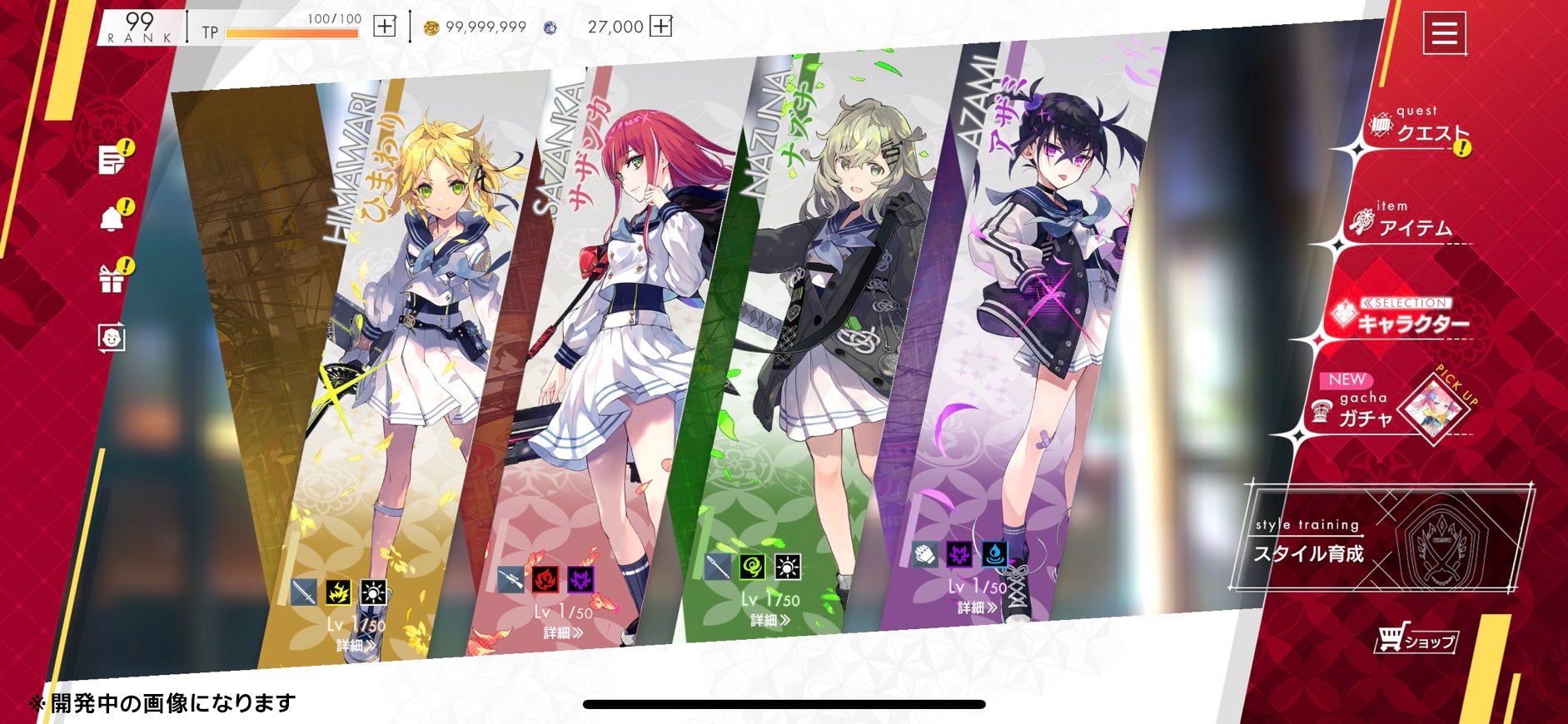 今回、第2回の生放送の開催に先立ち、ゲーム画面を一部先行公開いたします。先行公開するのは、ホーム画面やメインメニューのデザイン、キャラ育成の場となるスタイル育成に関連する画面となります。スタイル育成は、“四季山四階創”と呼ばれる世界観から演出までこだわりぬいた育成システムを紹介しています。また、クノイチとサムライを使用して挑むシミュレーションバトルは、高低差や障害物の要素を取り入れたマップで展開し、属性や武器種の相性、実行したコマンドの内容に応じて入れ替わる行動順など、高い戦略性を備えたバトルシステムに仕上がっています。第2回の生放送の中では、バトルまで一連の流れから育成の世界観の紹介まで詳しく触れていきますので楽しみにしてください。