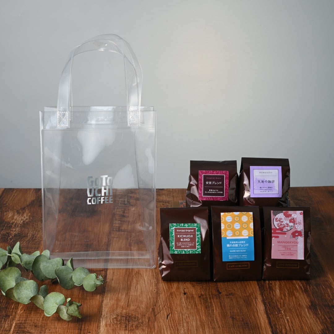 大地の珈琲 100g×1個、吉祥寺ブレンド 100g×1個、万華鏡 100g×1個、晴れの国ブレンド 100g×1個、安芸ブレンド 100g×1個(中細挽き)合計500gが入ったセットです。全国のご当地コーヒーで旅行気分を楽しみませんか?