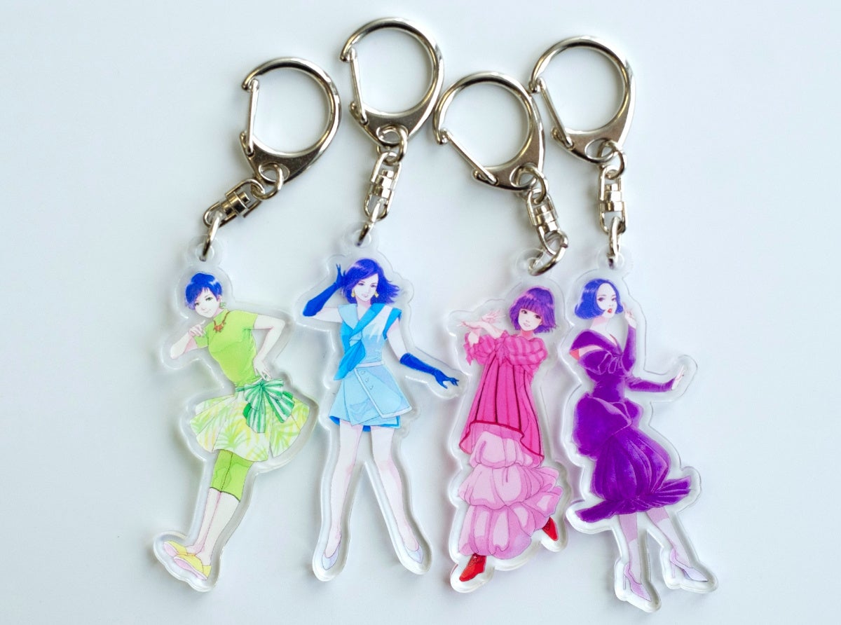 ひとりひとりの出演者イラストを施したアクリルキーホルダー。全4種が入ったガチャガチャによるランダムでの販売です。ぜひあなたの推しのキーホルダーを手に入れてください!