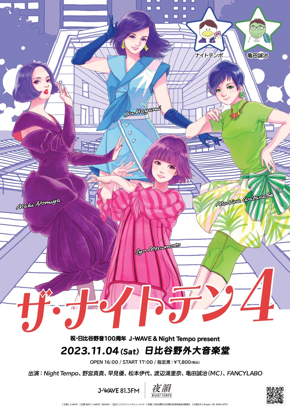 ラジオ局J-WAVE(81.3FM)は、DJ/音楽プロデューサーのNight Tempoとタッグを組み、野宮真貴、早見 優、松本伊代、渡辺満里奈の「4」人をゲストに迎えるスペシャルイベント「祝・日比谷野音100周年 J-WAVE & Night Tempo present ザ・ナイトテン4」を11月4日(土)に100周年を迎える日比谷野外音楽堂で開催いたします。