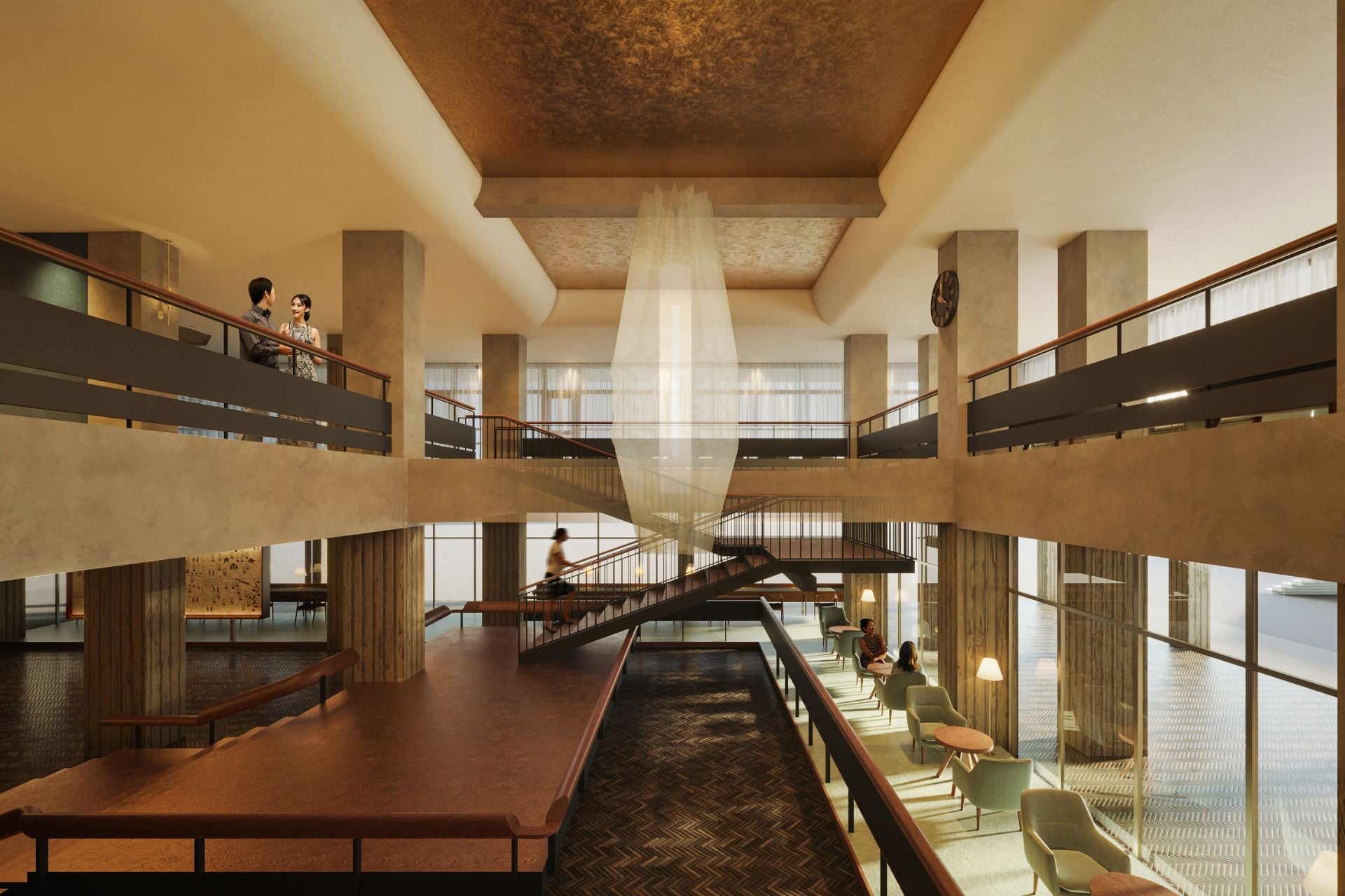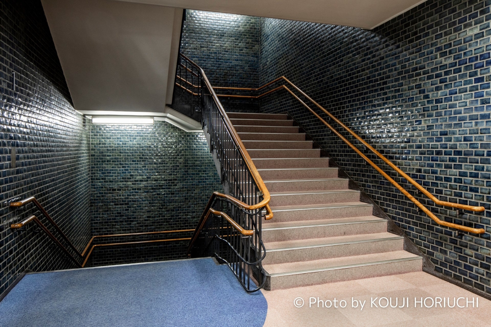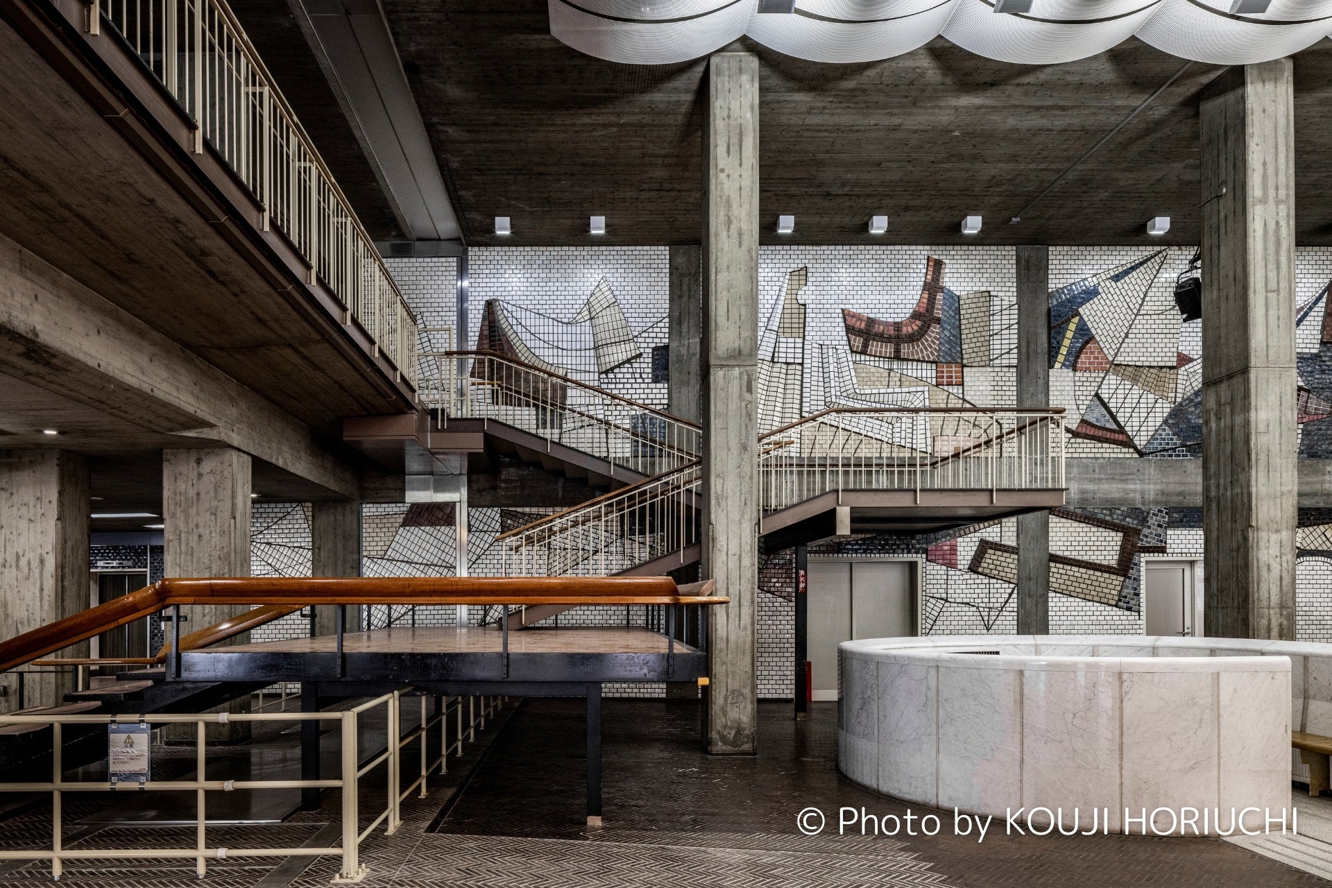 旧市庁舎内には村野氏と繋がりのあった彫刻家・辻晋堂氏の泰山タイルアート(タイトル「海・波・船」)が施されていますが、改装後はカフェの壁面としてそのまま使用します。また、村野氏は「手すりの名手」(*3)と評される程、階段の手すりのデザインにおいて豊かな表現をしていたと言われています。旧市庁舎内の市民広間で使用されていた大階段をホテルの吹き抜けに移設再現し、滑らかな曲線を含む手すりの一部も再活用します。