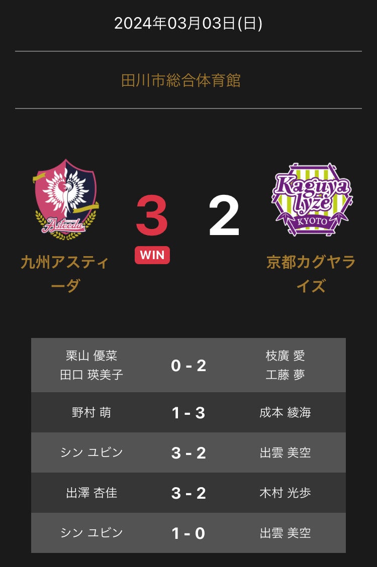 ノジマ リーグ 2023-2024シーズン 公式戦 3月3日開催 九州アスティーダ vs 京都カグヤライズ 試合結果
