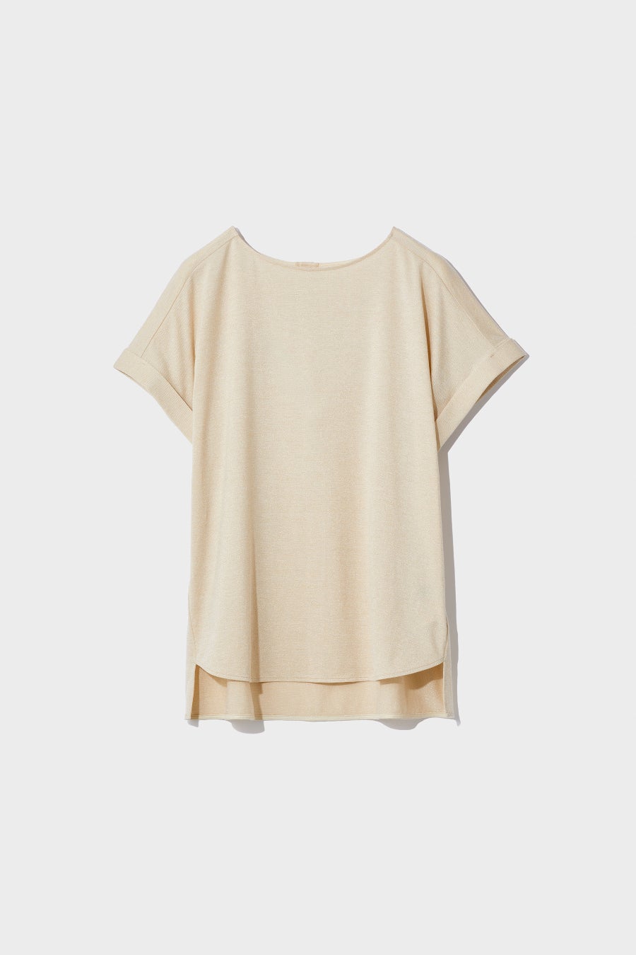 異素材コンビネーションのカットソー。同じ色でも質感が違うので、風合いのさりげない違いが楽しい。ふんわりと軽やかな素材感が、上品で優しい印象を演出。シンプルでありながらも、どこか特別な存在感を放ちます。