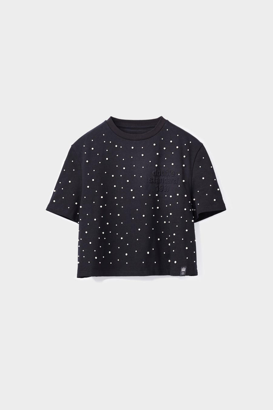大小さまざまなイミテーションパールを散りばめ、甘すぎないエッジをきかせたカットソー。ひとつひとつ指先でたどりたくなる、宝探しのような感覚。エンボス加工のブランドロゴがさりげないアクセントに。