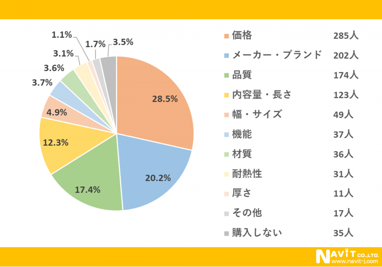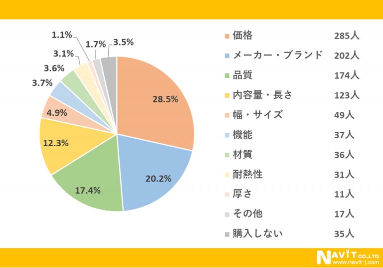 「ラップを購入する際、最も重要視している点は何ですか?」という質問については、「価格」が28.5%、「メーカー・ブランド」が20.2%、「品質」が17.4%という順になりました。