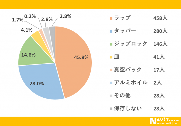 「食品を保存する際に、最も使用するものは何ですか?」という質問については、「ラップ」が45.8%、「タッパー」が28.0%、「ジップロック」が14.6%という順になりました。