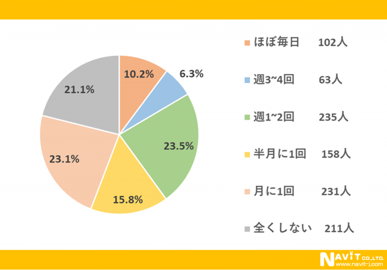 冷蔵庫整理の頻度については、「週1~2回」が23.5%、「月に1回」が23.1%、「全くしない」が21.1%という順になりました。