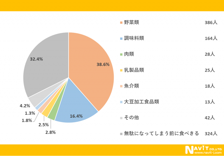 「食材の中でも最も無駄にしてしまうものは何ですか?」という質問については、「野菜類」が38.6%、「調味料類」が16.4%、「肉類」が2.8%という順になりました。