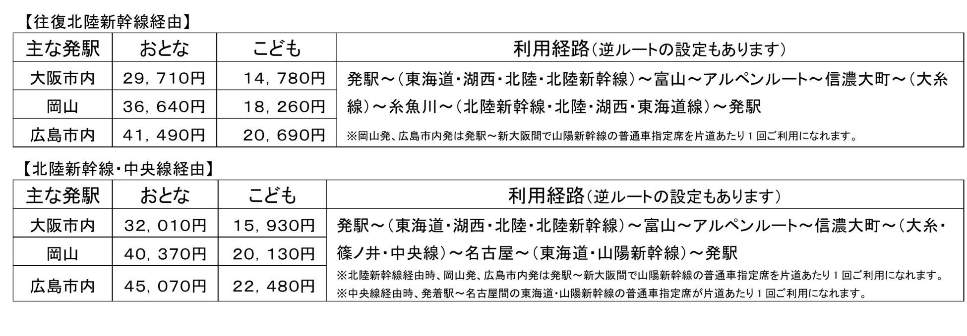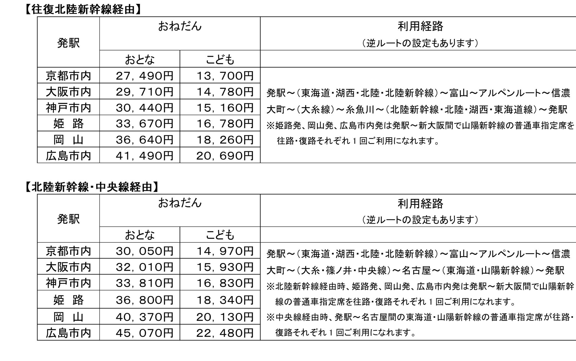 ・北陸新幹線を経由する場合、姫路、岡山及び広島市内発に限り、往路及び復路で発駅~新大阪間の山陽新幹線の普通車指定席が片道1回ご利用になれます(神戸市内、大阪市内及び京都市内発のきっぷでは山陽新幹線はご利用になれません。)なお、新大阪~京都間は東海道新幹線のご利用はできません。
