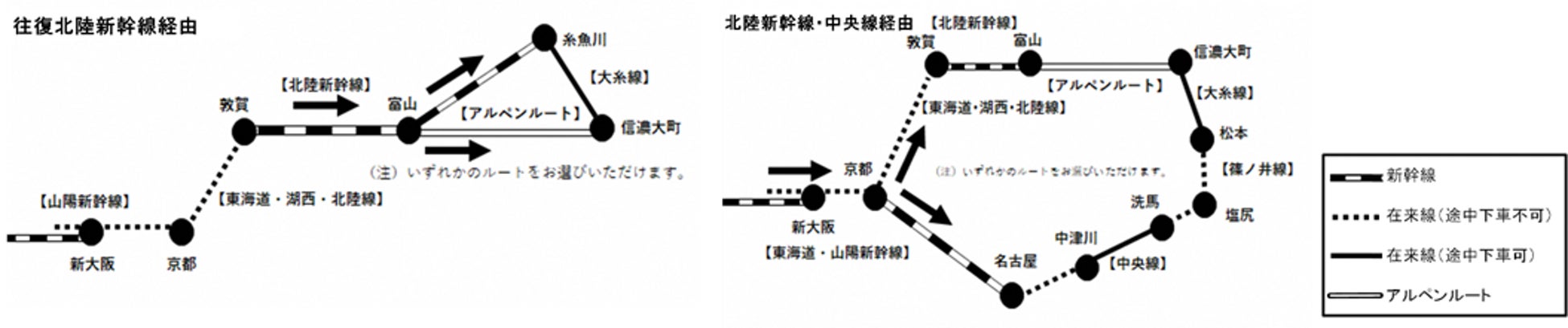 ・アルペンルートまでの往路及び復路で、特急列車の普通車指定席を片道1回ご利用になれます。普通車指定席を利用した区間以外は普通車自由席をご利用になれます。ただし、新大阪~京都間の東海道新幹線のご利用はできません。なお、敦賀~富山間及び敦賀~糸魚川間は北陸新幹線の普通車指定席がご利用になれます。