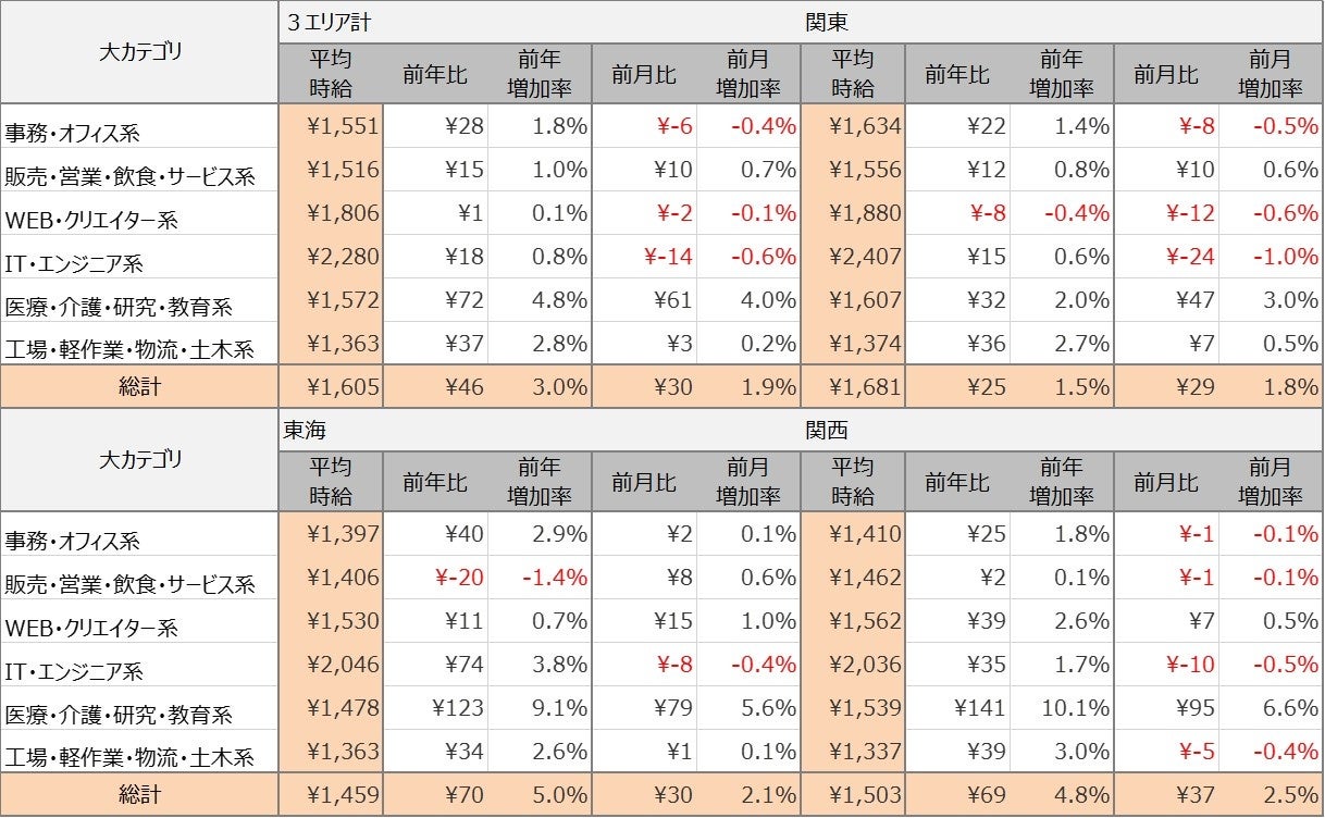 各エリアの平均時給について、関東エリアは1,681円(前年比25円増、前月比29円増)、東海エリアは1,459円(前年比70円増、前月比30円増)、関西エリアは1,503円(前年比69円増、前月比37円増)となりました。