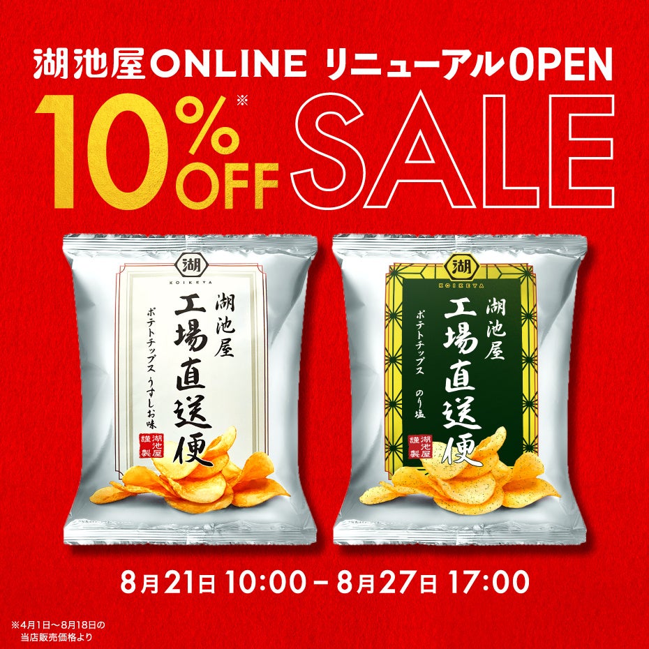 8月21日(水)~8月27日(火)17:00まで販売の「湖池屋 工場直送便ポテトチップス」が10%オフでお買い求めいただけます。