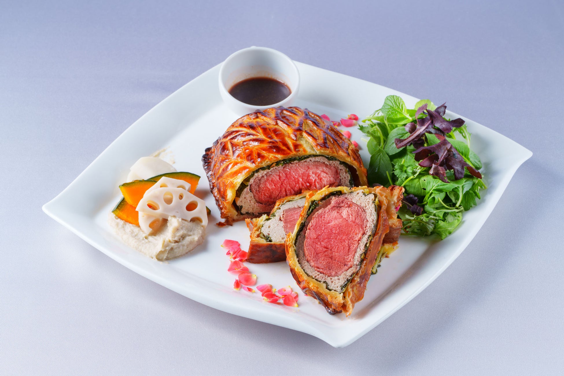パイ生地で鶏ムネ肉ときのこのムースと、宮城県産のちぢみ雪菜、脂身が少ない肉質の牛モモ肉を包み込み焼き上げました。バター香るパイ生地、しっとりとした牛肉の旨味が口の中で贅沢に広がります。添えられたトリュフ香るマッシュポテトと、豊かな香りのマデラソースが肉の美味しさを際立たせます。