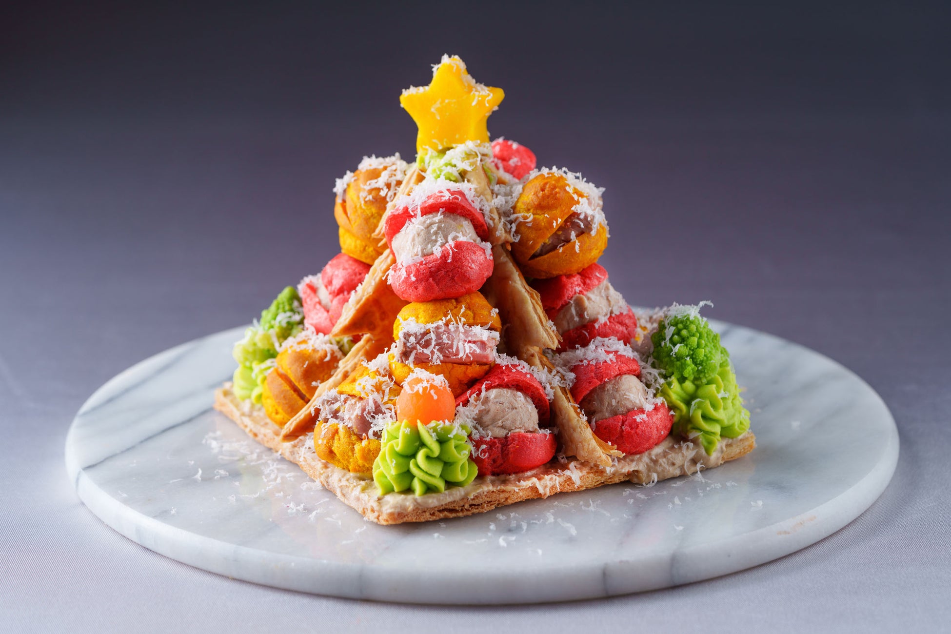 ローストビーフと柑橘風味のマスタードソースをサンドした黄色いシューと、栗駒高原カテキン豚バラ肉のリエットとローストナッツ、コンポートにしたプルーンを挟み込んだ赤いシューを重ねてクリスマスツリーに仕立てました。土台のパイ生地も美味しくお召し上がりいただけるよう、フォアグラのクリームを合わせ、トップには、粉雪に見立てたパルメザンチーズを降らせた可愛らしい逸品です。
