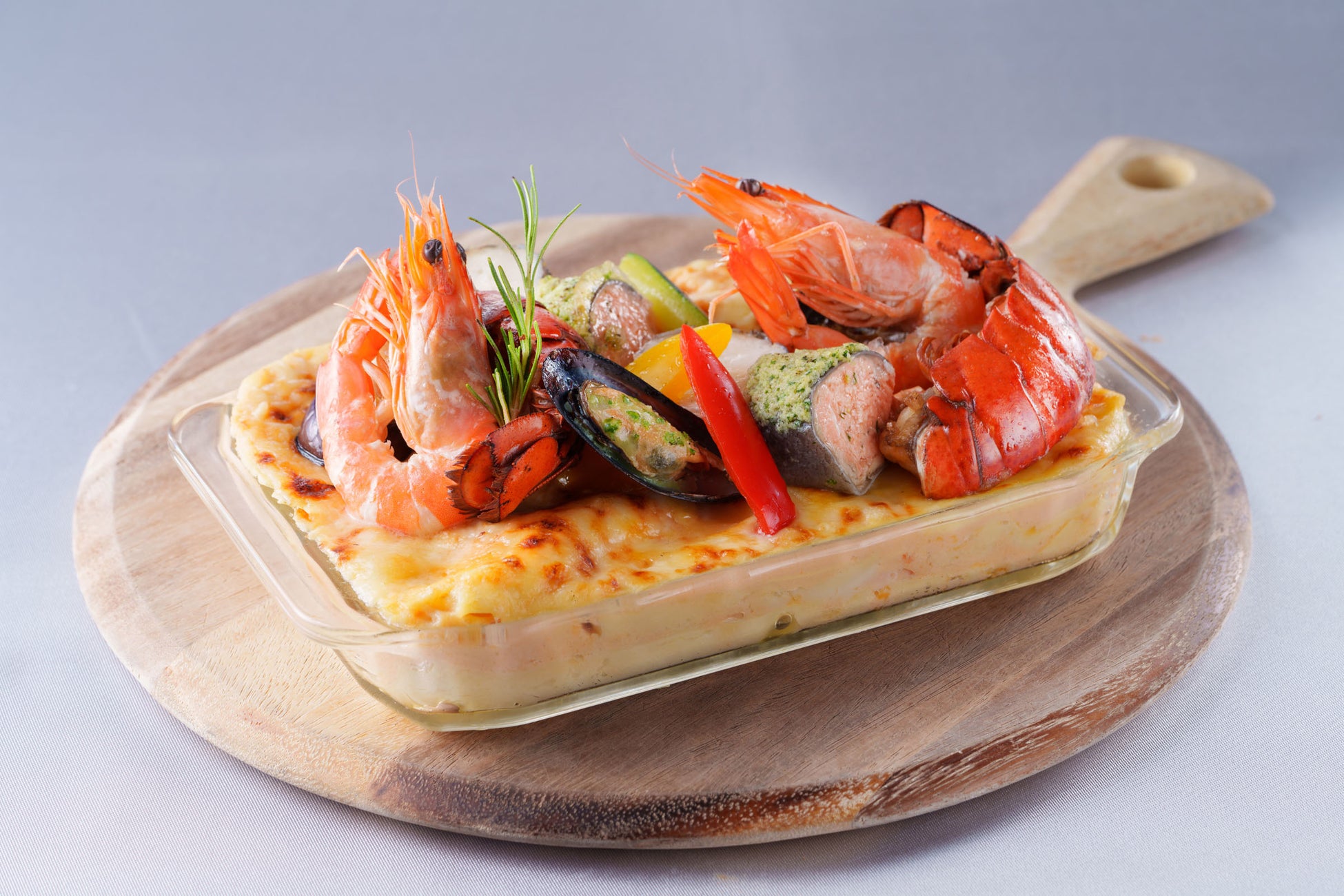 ズワイ蟹の身を入れたアメリケーヌソースとホワイトソースのラザニアに、オマール海老をはじめ、天使の海老、みやぎサーモン、真鯛などの豊かな海の幸を贅沢に盛り付けました。オーブンで温めて、熱々をお召し上がりください。