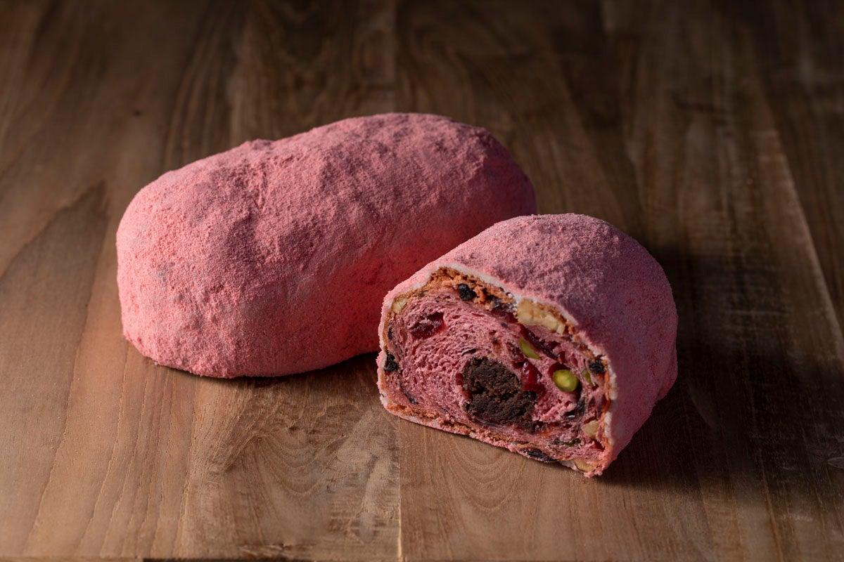 いちごテイストの生地に、クランベリーとブルーベリーのドライフルーツ、ピスタチオ、ウォールナッツを加えたフルーティーなシュトーレン。鮮やかなピンク色で、ほのかな甘さと爽やかないちごの香りが口いっぱいに広がります。