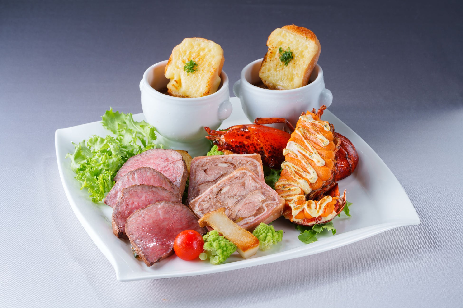 断面が美しい「赤ワインで煮込んだターキーのテリーヌ」や、奥深い味わいで身も心も温まる「オニオングラタンスープ」、オマール海老1尾を豪快に焼き上げた「オマール海老のテルミドール」、香ばしく焼き上げた 「宮城県産日高見牛サーロインのグリル」の4品をバリエーション豊かに盛り合わせました。