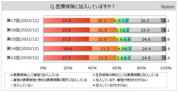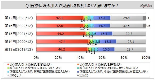 <今 回>(2023/12)https://myel.myvoice.jp/products/detail.php?product_id=30507 上記設問の他に、「加入時の申し込み経路」「加入したい医療保険会社」も聞いています。 <第16回>(2022/12)https://myel.myvoice.jp/products/detail.php?product_id=29310 <第15回>(2021/12)https://myel.myvoice.jp/products/detail.php?product_id=28106 |