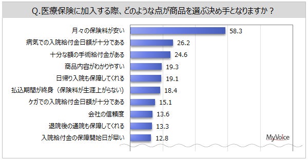 医療保険に加入する際、商品選定の決め手となる点は(複数回答)、「月々の保険料が安い」が58.3%、「病気での入院給付金日額が十分である」「十分な額の手術給付金がある」が各20%台、「商品内容がわかりやすい」「日帰り入院も保障してくれる」「払込期間が終身」が各2割弱です。