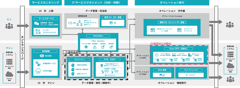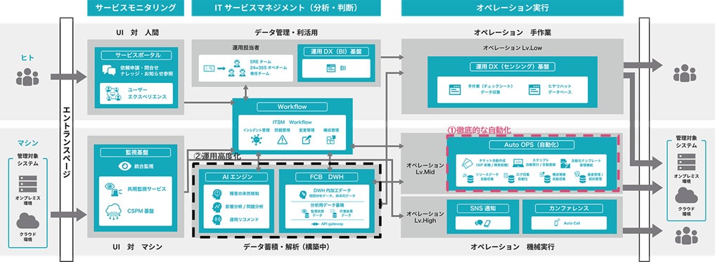 今回提供開始する自動オペレーション機能(AutoOPS)は、「➀徹底的な自動化」を推進する機能であり、保守・運用作業を自動化することで、ヒューマンエラー減少による品質向上に寄与し、より安心安全なシステムの高度化運用を実現します。