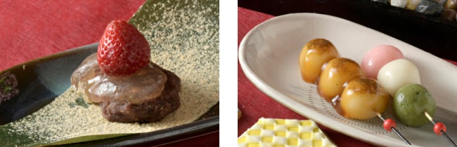 季節のショートケーキ / 抹茶のモアールショコラ / クロカント / あまおうモンブラン / 和栗のモンブラン / 抹茶のブラウニー / ほうじ茶の生チョコ / 林檎のタルト / 黒胡麻プリン / 抹茶のオペラ / ブランマンジェ / ガトーショコラ / きな粉揚げ餅 / 揚げアイスだいふく / 柚子ゼリー / 黒蜜クイニーアマン / 米粉和三盆ロール / 八女抹茶のテリーヌ / 八女抹茶チーズタルト / やぶれまんじゅう / どら焼き / おはぎ / チーズ豆富 / 抹茶餡餅 / わらび餅 / 羊かん盛り合わせ / みたらし団子 / きな粉棒 / 桜餅 / 琥珀糖 / 二色麩の田楽 / 白玉入りお汁粉 / いきなり団子 / 黒糖かりんとう / 豆富ドーナツ 等