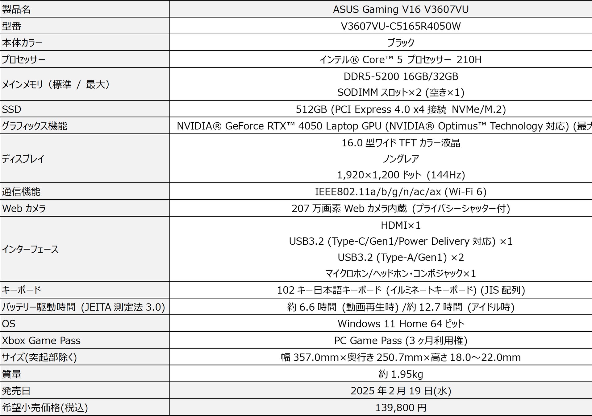 ※ASUS Gaming V16 V3607VUの詳細スペックはこちらからご確認ください。