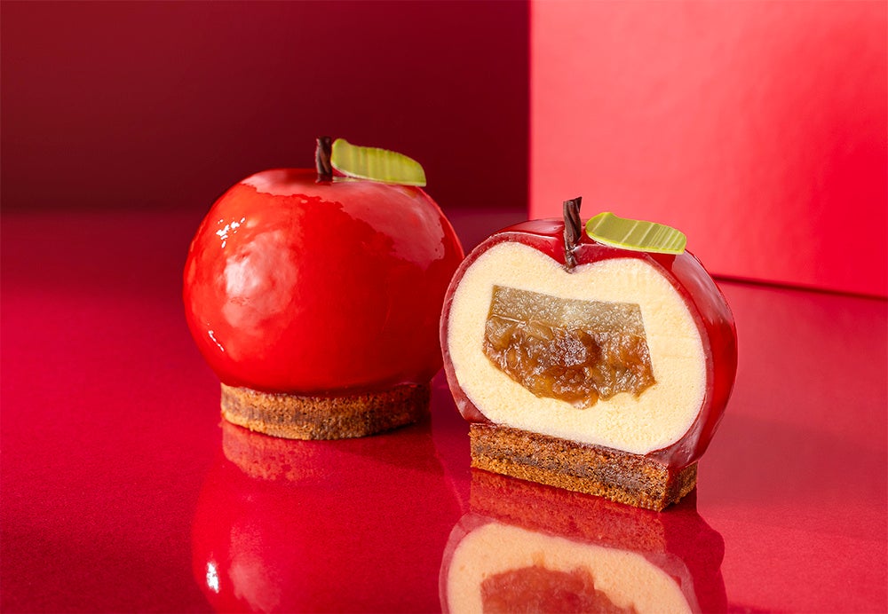 可愛すぎる見た目はもちろん、味わいもりんご尽くしの『THEアップル』。つやつやのりんごグラサージュにぎっしりと包まれているのは、カスタードにバターを加えたりんご風味のクレームムースリーヌ。バターのコクとりんごの爽やかな風味がとけあう、くちどけなめらかなバタークリームです。さらに中には、グラニースミス使用の自家製コンポートときゅんと甘酸っぱいアップルジュレを2層仕立てに重ねました。ひとくち頬張れば、もぎたてりんごのようにジューシーな美味しさがおくちいっぱい広がります。