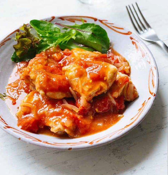 ①耐熱の皿にタマネギ、トマトを広げ、皿の縁に沿って鶏肉を並べる。肉の上に合わせた調味料を均等にかけ、ラップをせずに電子レンジ(600W)で5分ほど加熱する。