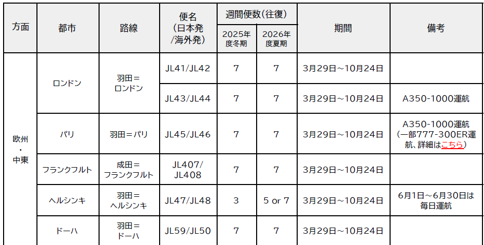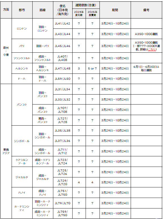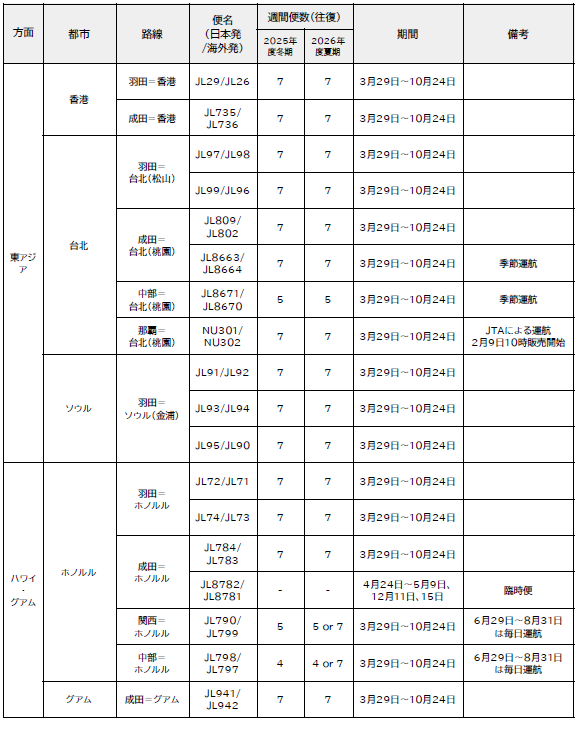 JAL/JTA、2026年度 路線便数計画(国際)を決定
