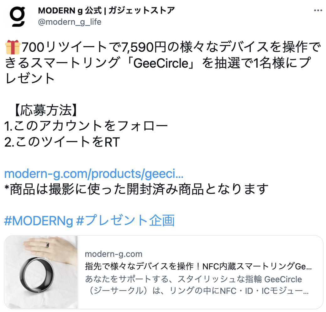 【7,590円の指先で様々なデバイスを操作!NFC内蔵スマートリングGeeCircleをプレゼント!】MODERN gの公式Twitterで毎日ギブアウェイキャンペーン中!